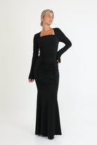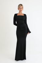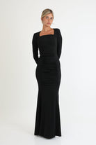 שמלה עם מחשוף מרובע, כיווצים במותן ובירכיים שרוולים ארוכים עם פתח קל