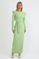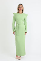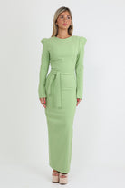 שמלה ארוכה כתפיים מודגשות ,בצירוף חגורה
