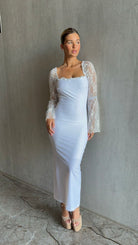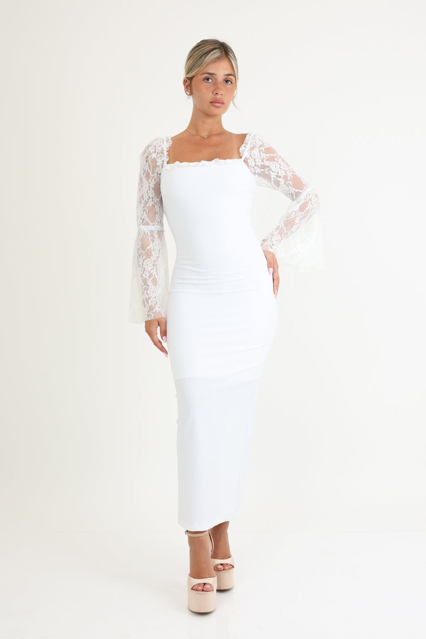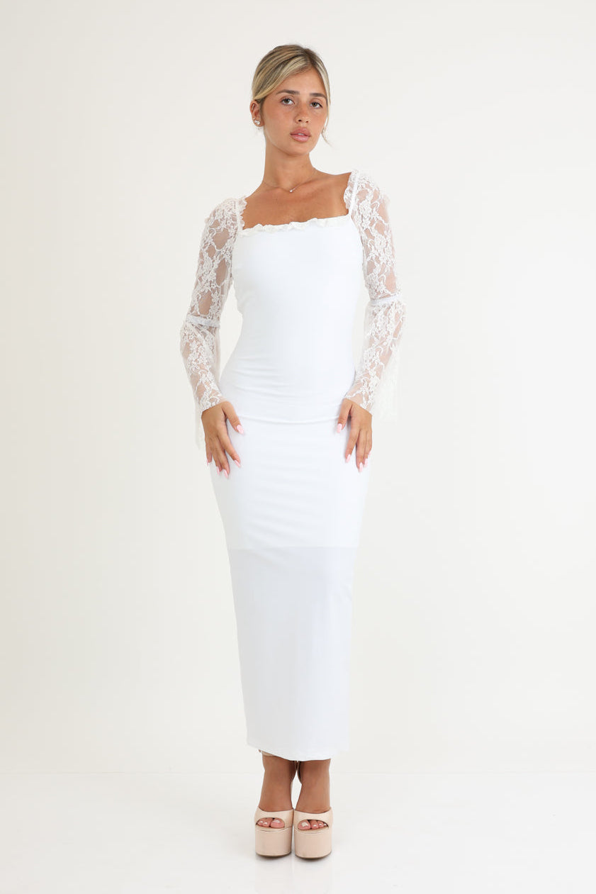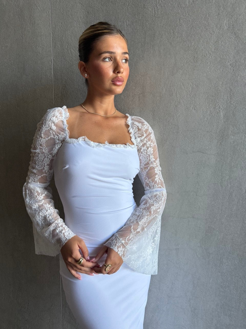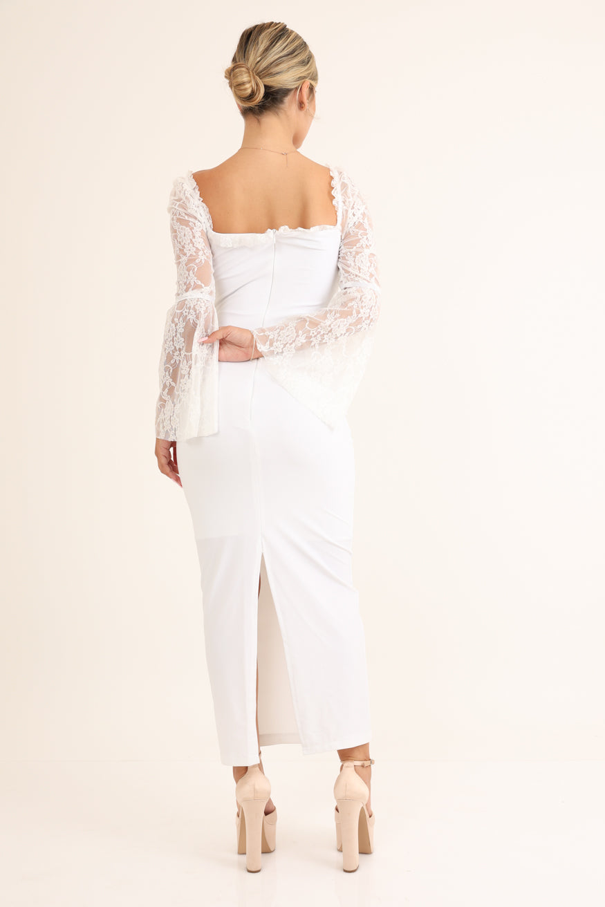 שמלה צמודה עם שרוולי תחרה ומחשןף מרובע בסגנון אלגנטי ורומנטי.