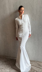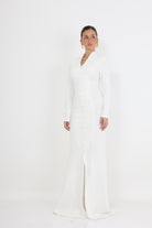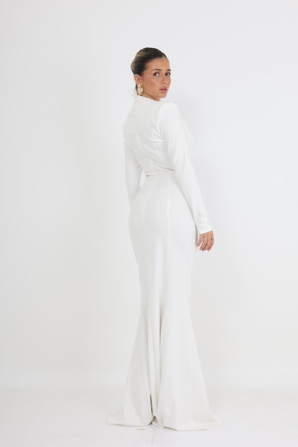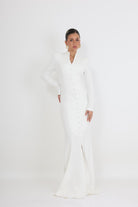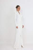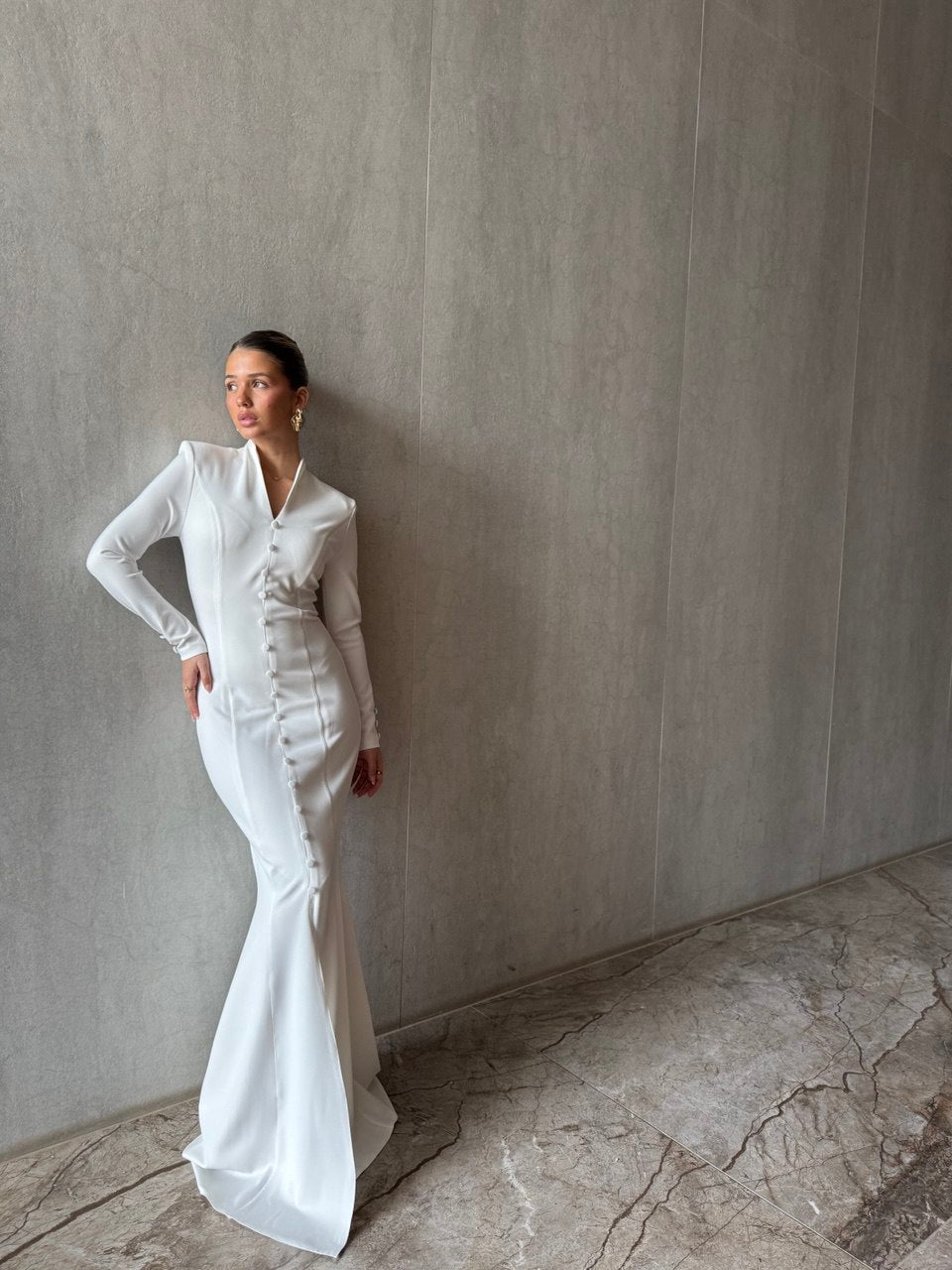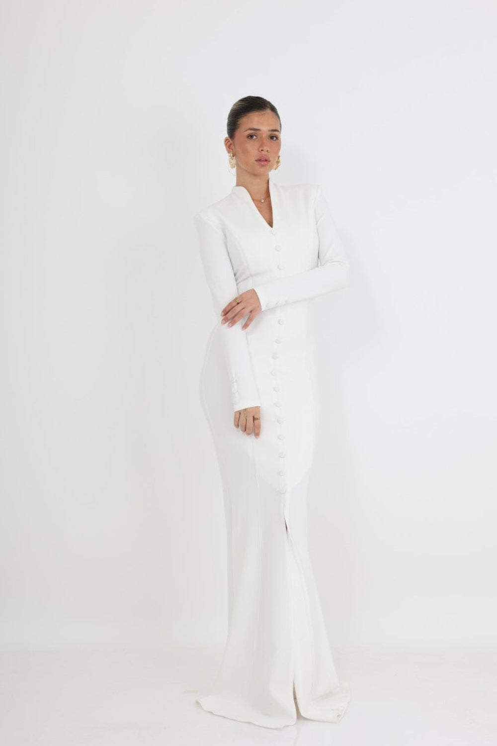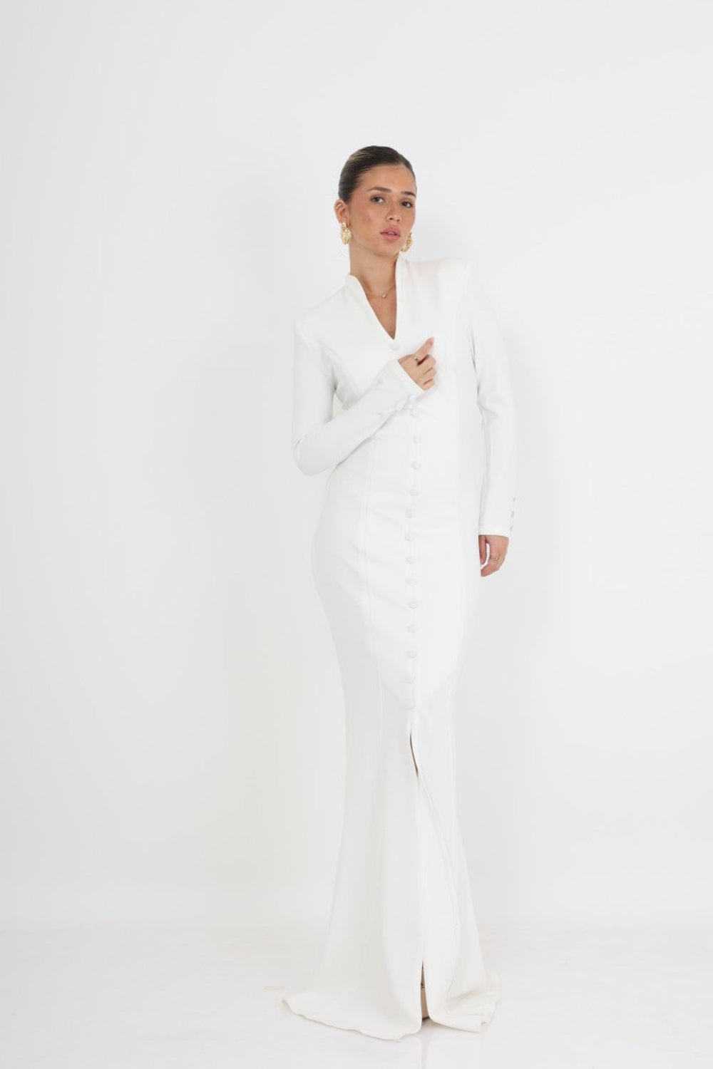 השמלה מתאפיינת בצווארון מוגבה המשתלב עם מפתח V עדין, ושרוולים ארוכים המעניקים מראה מכובד ואלגנטי. שורת כפתורים עדינה (Drape) הנמשכת לאורך כל החזית יוצרת אשליה של גובה ומחמיאה לגוף, בעוד השסע הקדמי העדין מוסיף נגיעה של תחכום ותנועה.