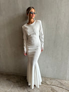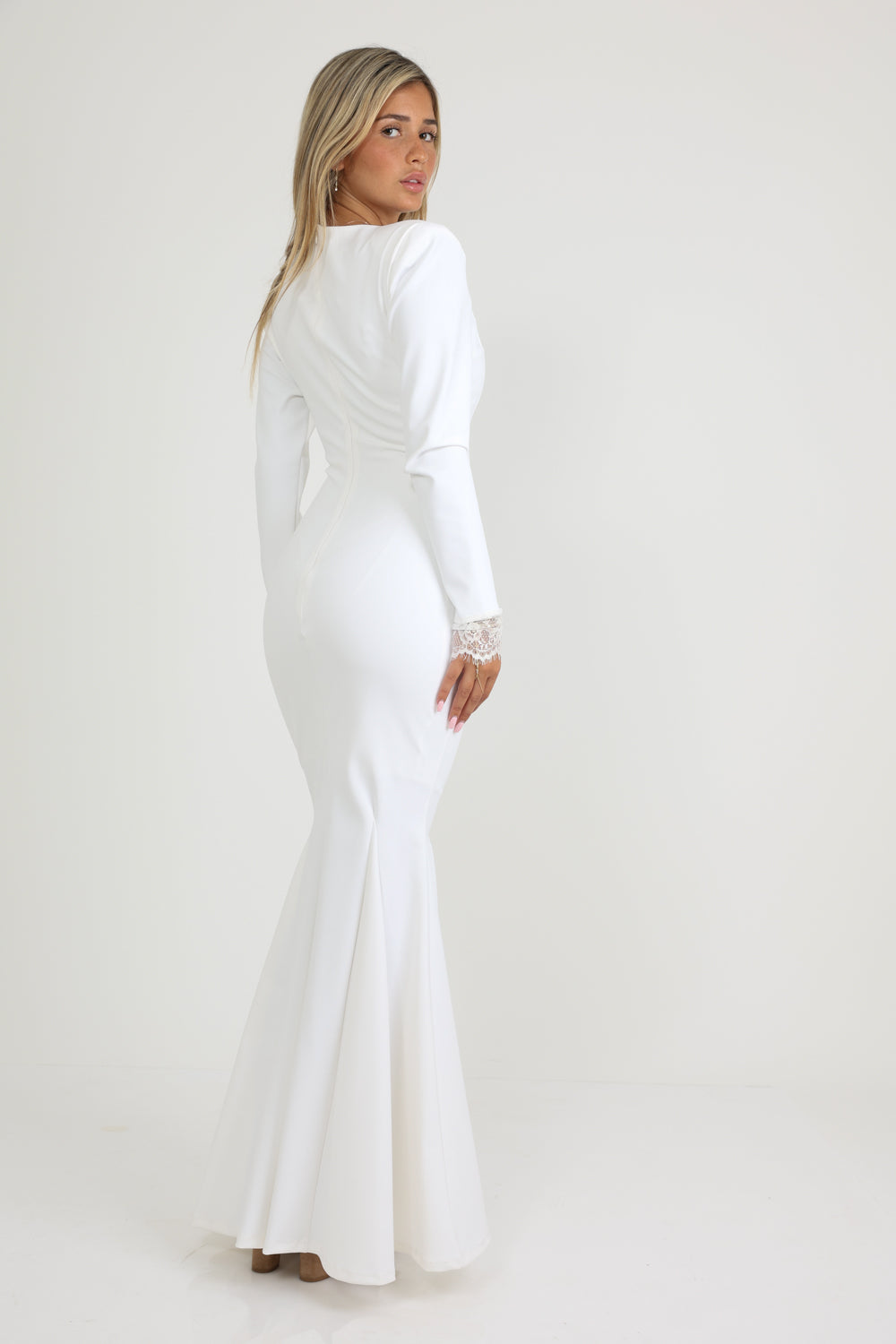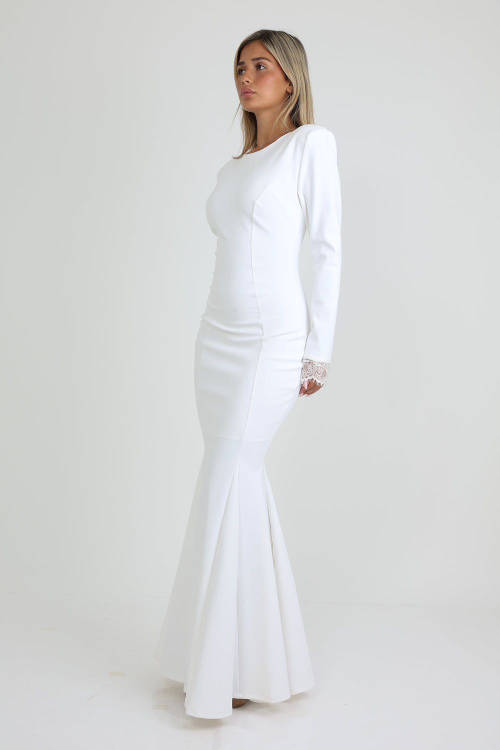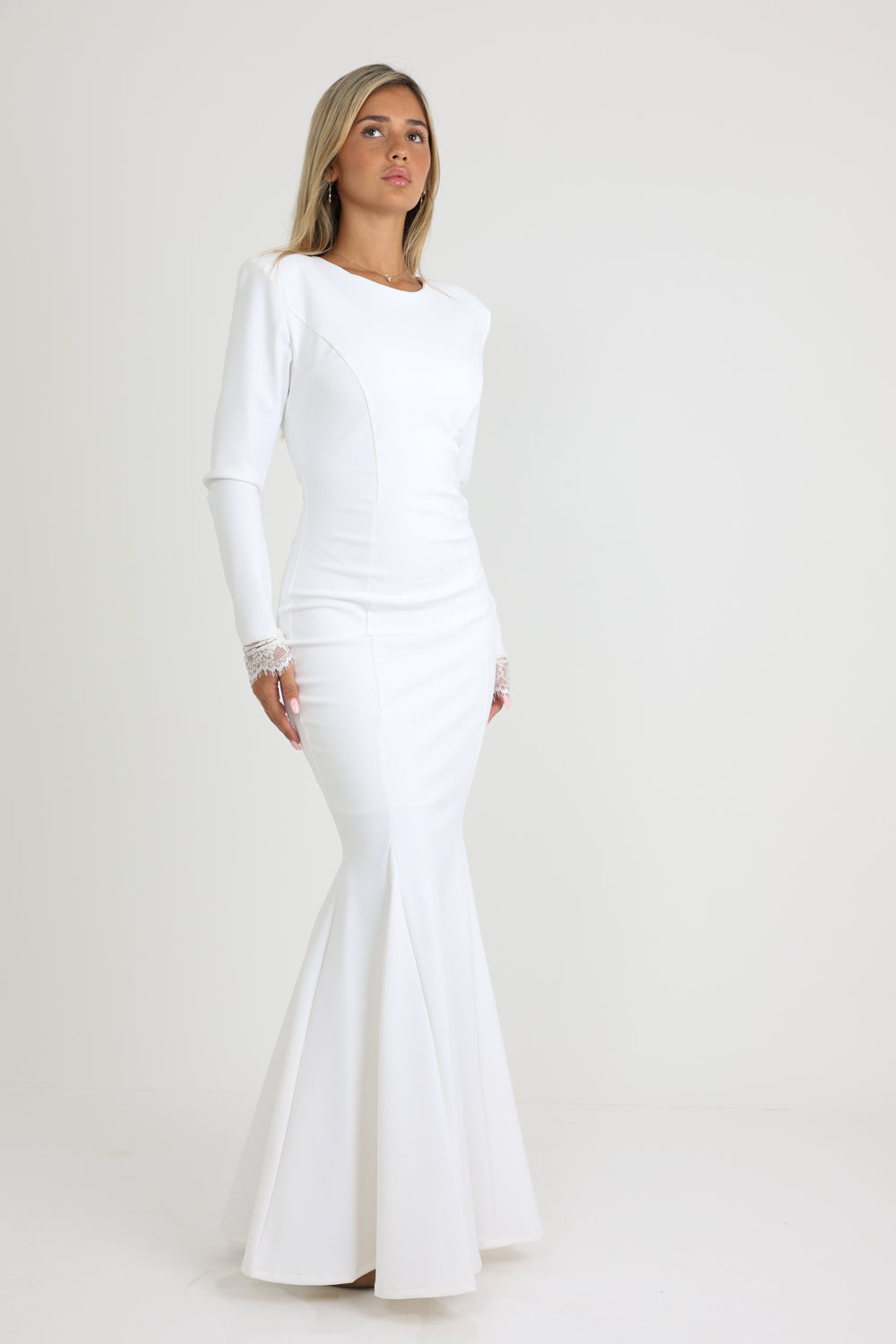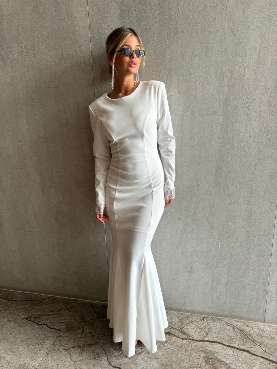 שמלה ערב בגזרת בת-ים צמודה עם כתפיים מובנות ושרוולים בעיתור תחרה