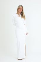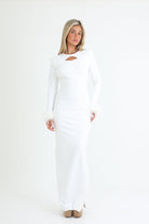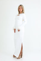 שמלה עם חתך עדין באזור החזה עם כתפיים מודגשות ושרוולים ארוכים עם פרנזים נוצתיים בקצוות