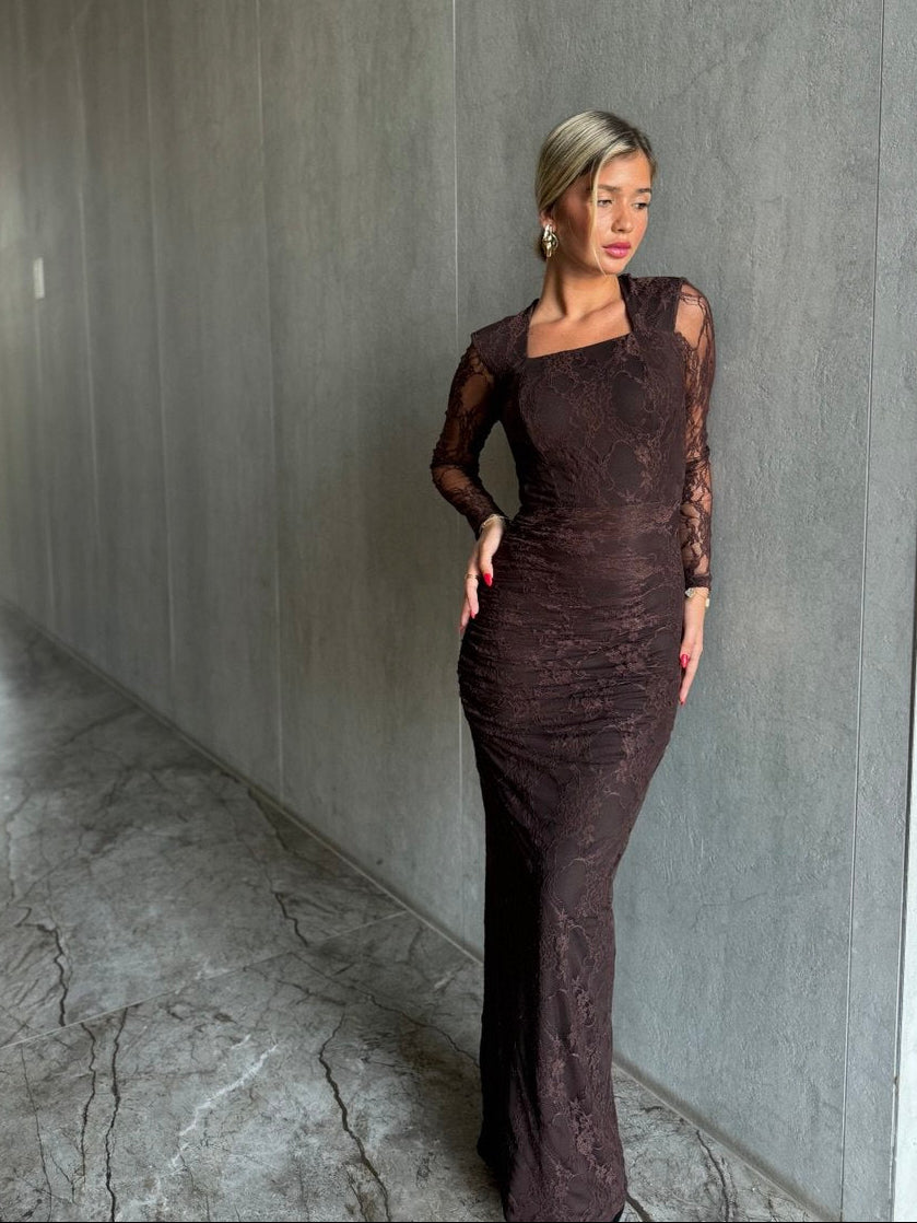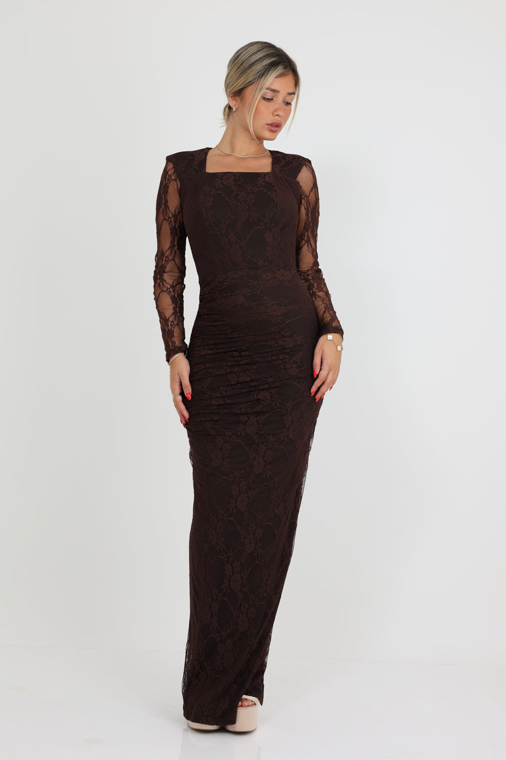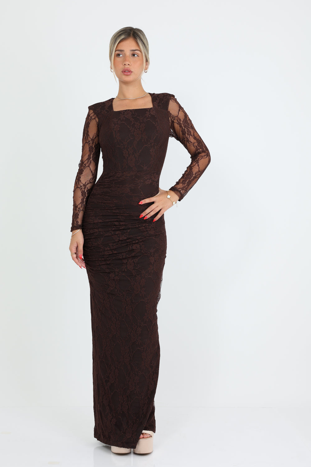 שמלה תחרה מחשוף מרובע בעלת כיווצים מחמיאים במותן