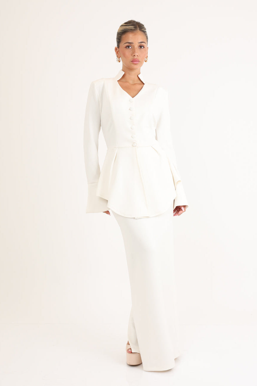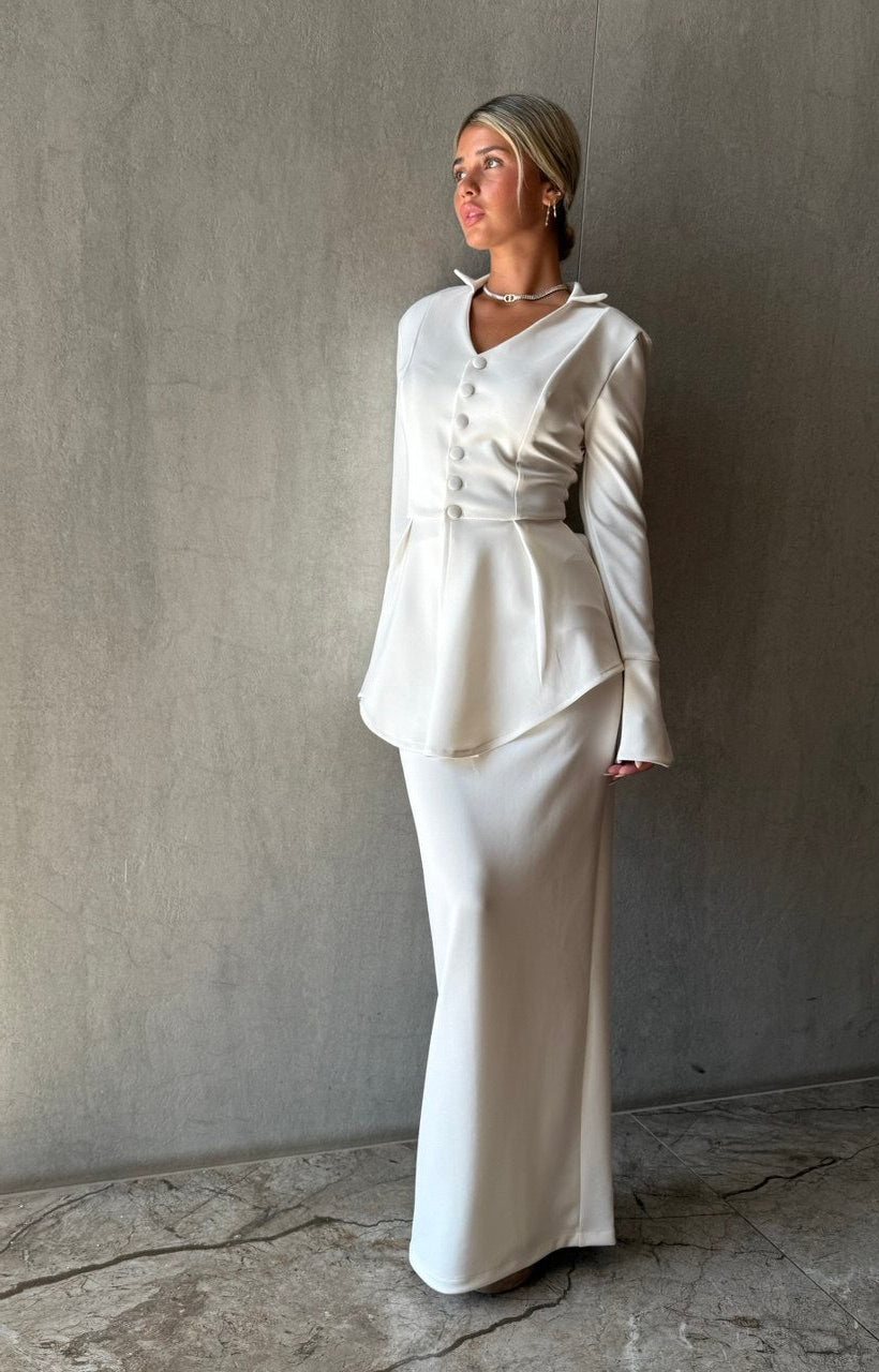 סט אלגנטי עליונית מחוייטת עם מחשוף וי כפתורים בחזית,חצאית קלאסית