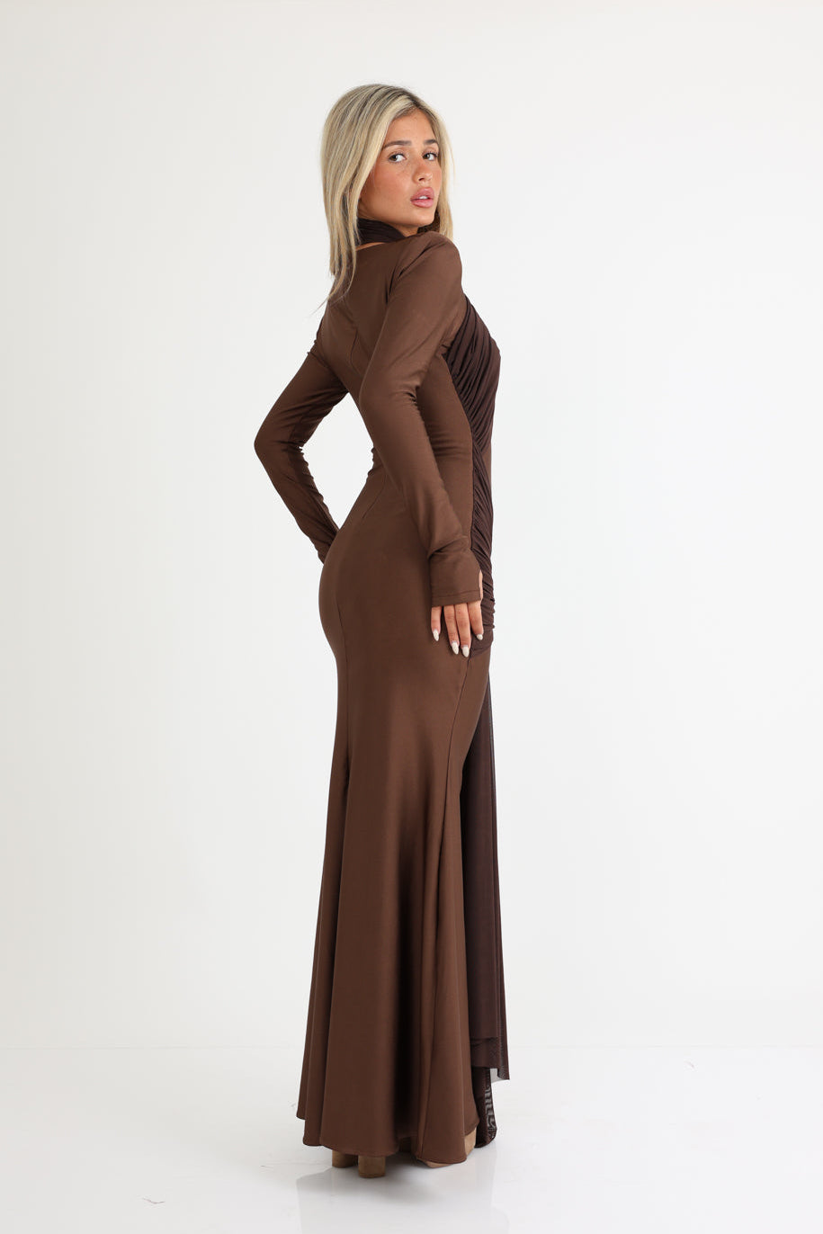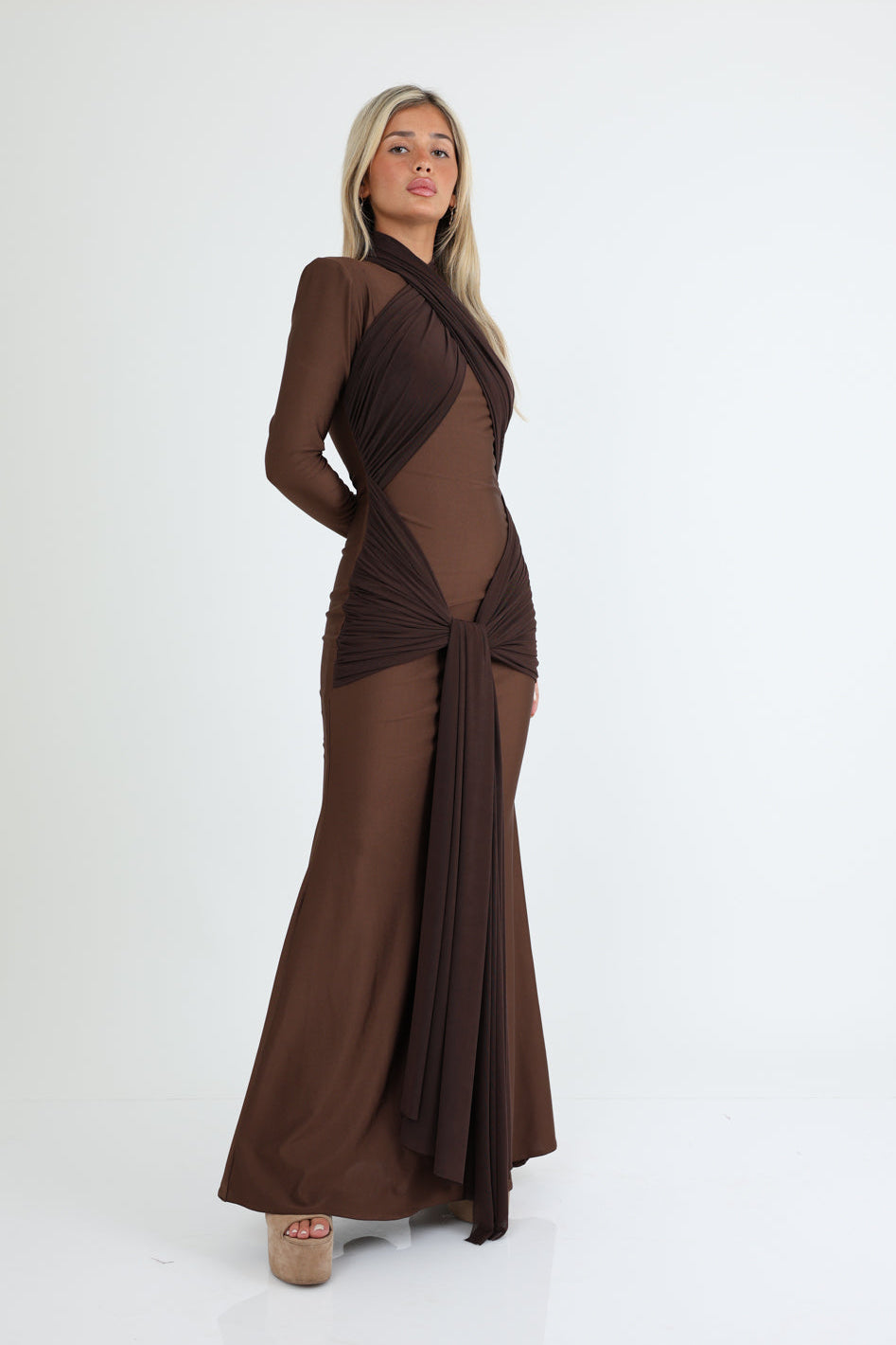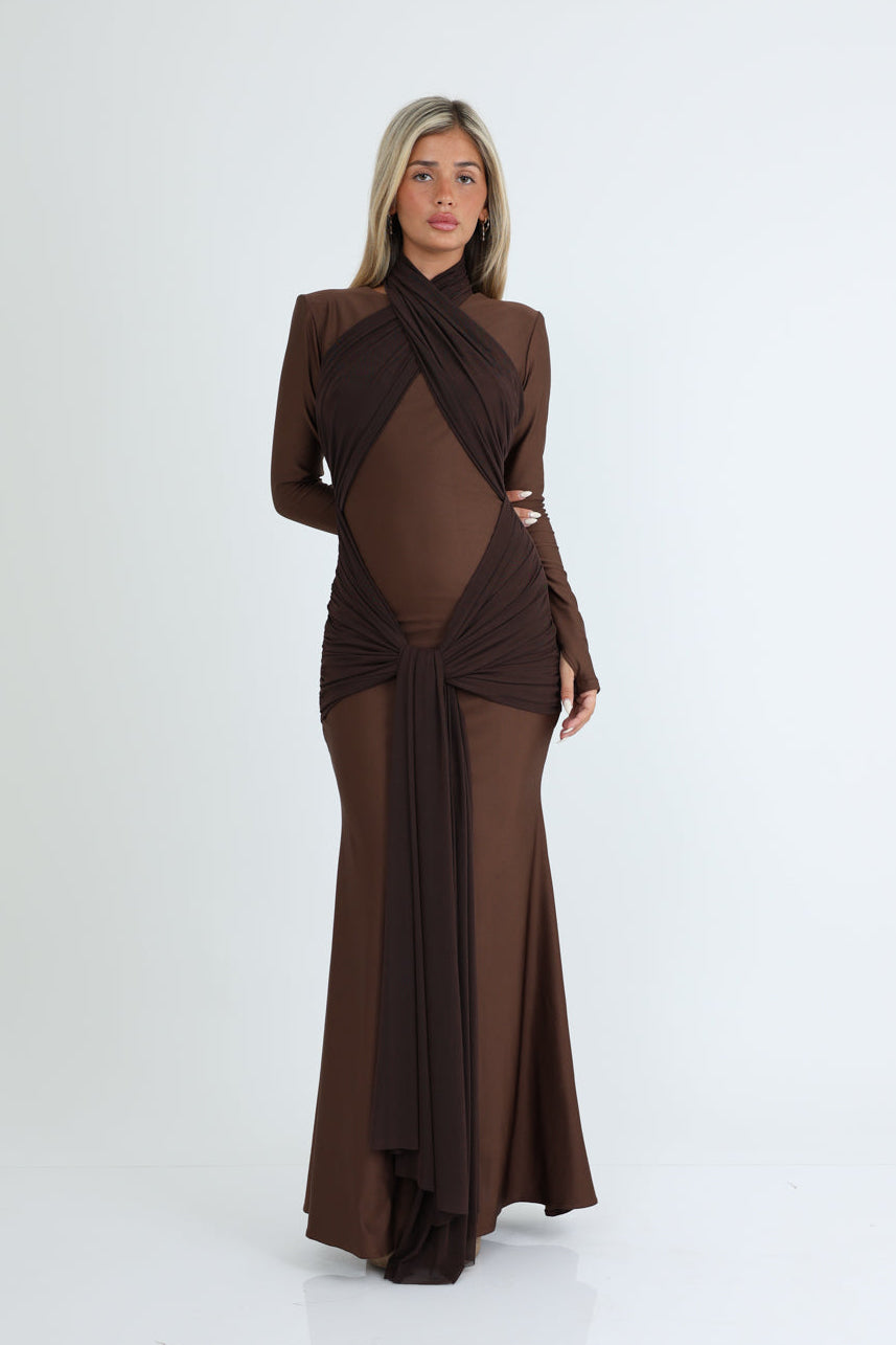 שמלה ערב דרמטית עם משחק קשירות וקריסופים בחזית בד רזיל שמדגישה את הגוף